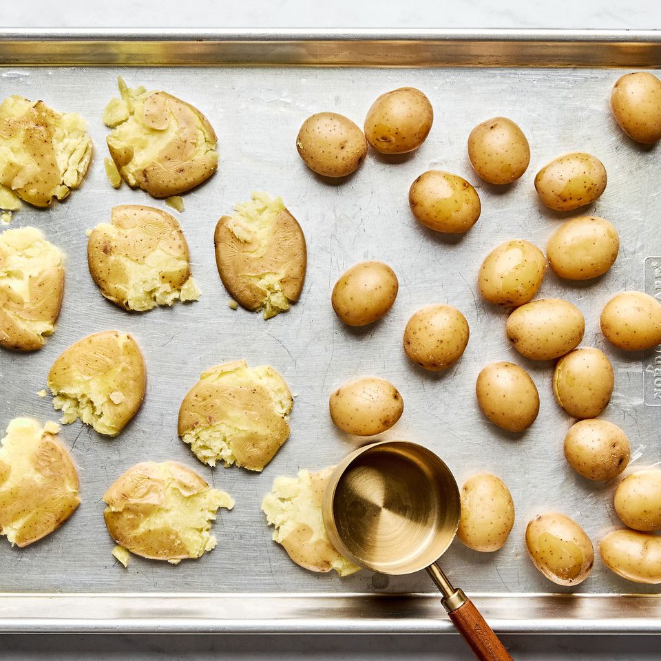 Việc ép dẹt giúp khoai tăng diện tích tiếp xúc với nhiệt, khi nướng sẽ có bề mặt giòn nhẹ, trong khi phần ruột vẫn mềm.